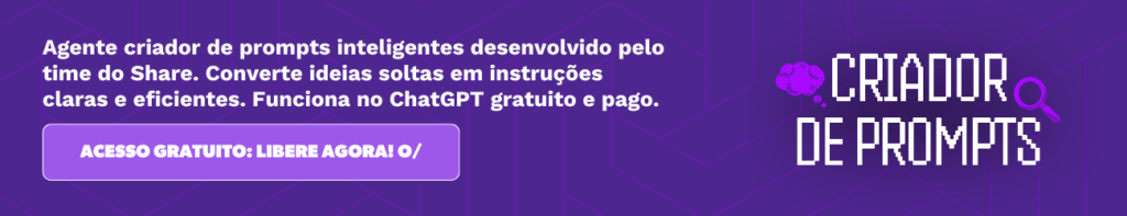 Para facilitar esse processo de criação de prompts (especialmente se você usa IA com frequência) recomendamos o nosso Criador de Prompts, um agente inteligente desenvolvido pelo time do Share que transforma ideias soltas em instruções claras e eficientes. Funciona tanto na versão gratuita quanto na paga do ChatGPT e permite que você economize tempo, siga boas práticas e obtenha resultados mais consistentes.